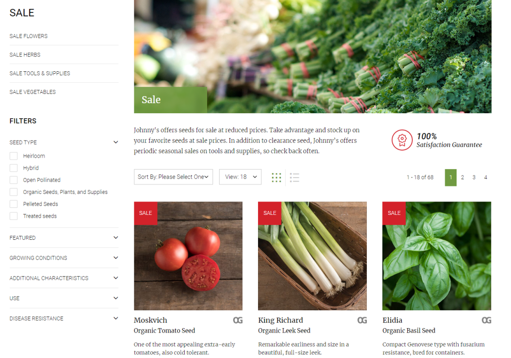 As a semi-regular customer at Johnny’s Seeds, there is a slight biased towards the website’s design; my first time shopping there was quick and easy, despite knowing little about gardening at the time. The shop has two filter areas and listed items are accompanied by short descriptions. The menu prioritizes purchase options, leaving pages like the about section in the footer.