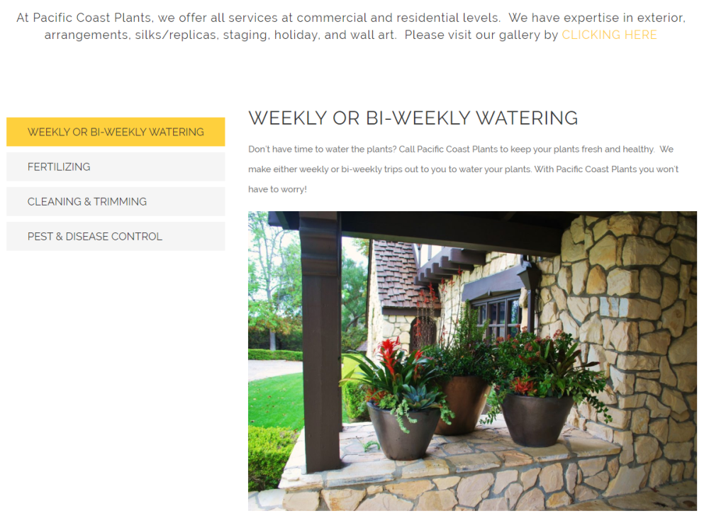 Pacific Coast Plants utilizes a very clean but user responsive design. The offered plant services are sectioned off by a secondary menu. The shop link opens a different website with categorized plants and respective prices. The contact page contains only an editable form to directly send emails.