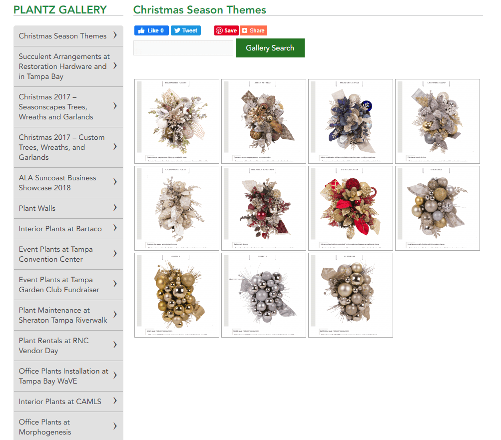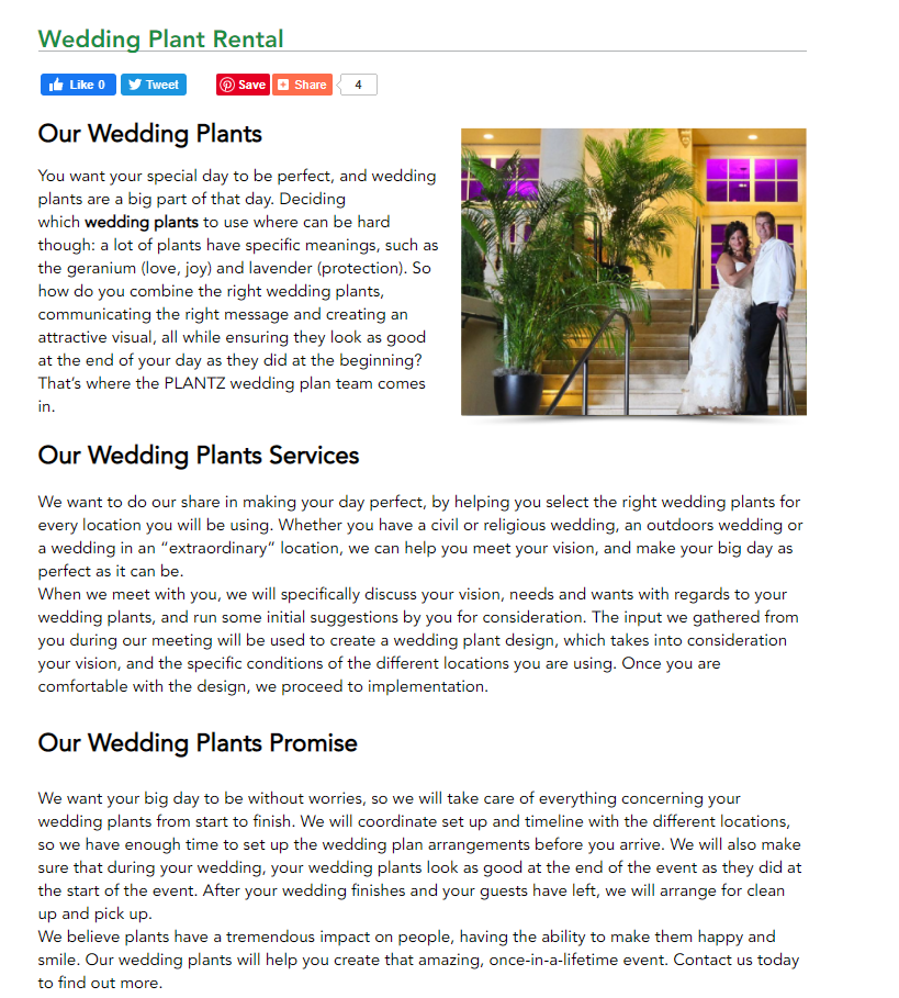 Plantz’s top banner immediately advertises social media and directs users to act via buttons and a phone number. The catalog is a separate page from the gallery, effectively listing available plants. The gallery page showcases the product in a real life setting by using past projects as examples; users can search by event type. There is a page designated for wedding rentals, offering stress-free, hands off service.